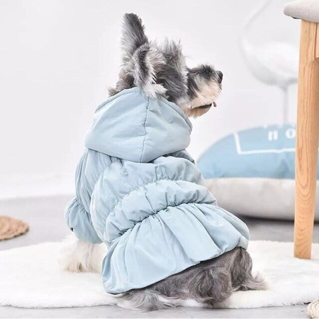 犬服として作られたこのコートは、犬の体型に合わせたデザインで、動きやすくお腹まわりもゆったりとした作りになっています。