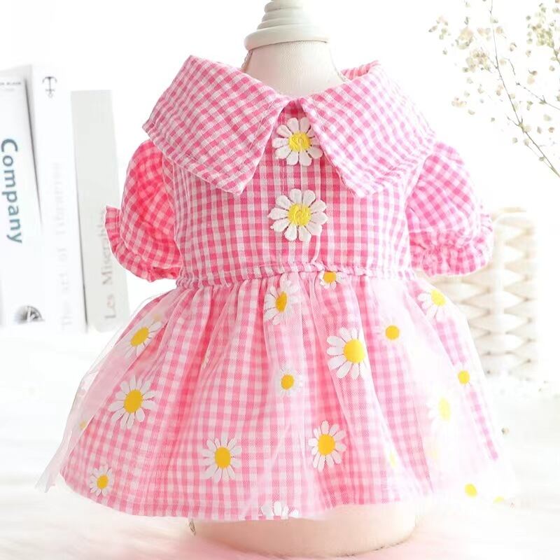 ギンガムチェックのワンピースの上に、マーガレット柄のレースが重ねられた、